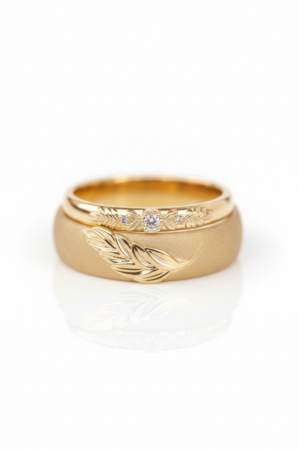 Radiant 18k gold bands that offer a timeless glow, accented with exquisite ruby floral motifs.