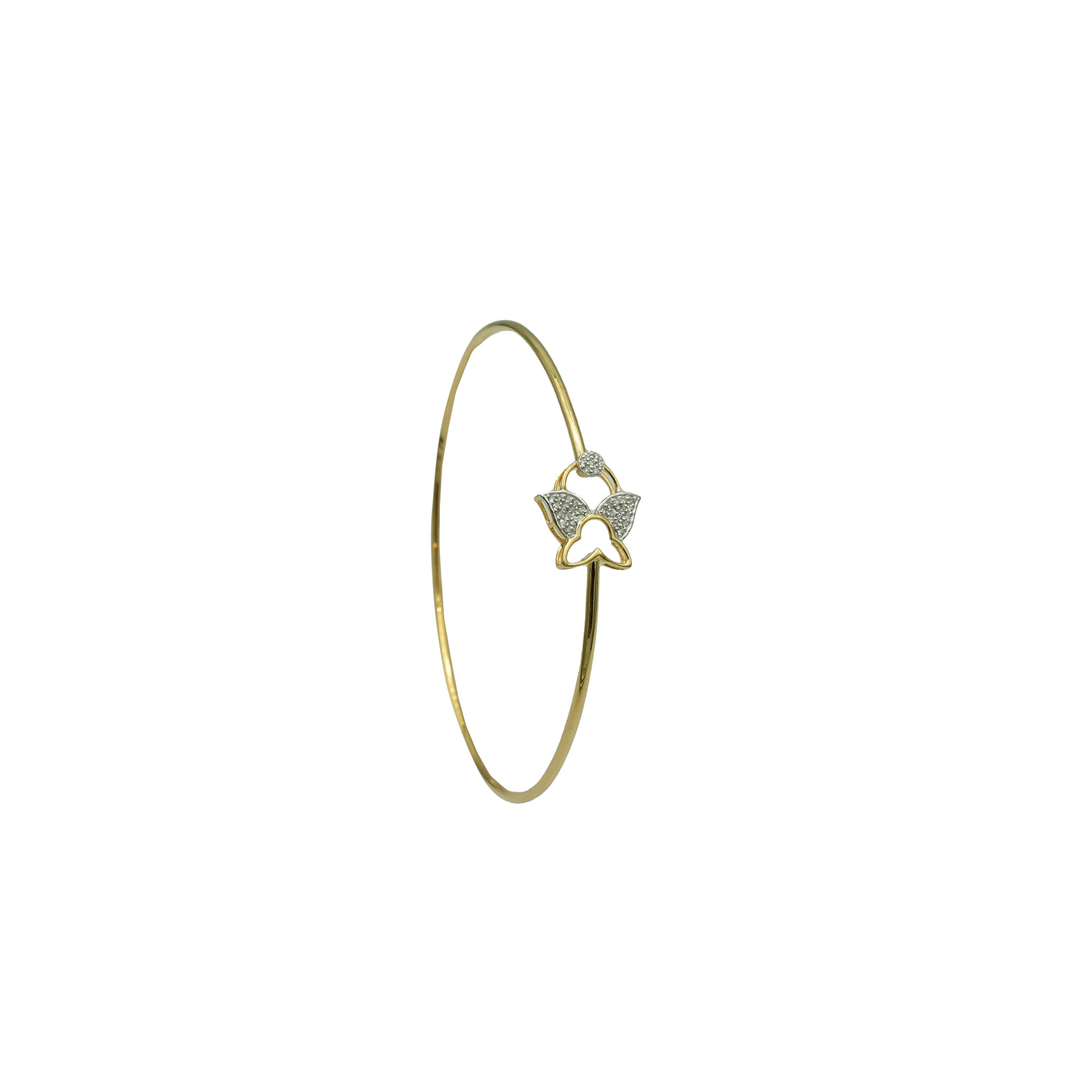This whimsical bangle features a stylized butterfly motif at its center. The butterfly design is split, with the upper wings encrusted in pavé-set stones and the lower body remaining as a hollow polished gold silhouette.